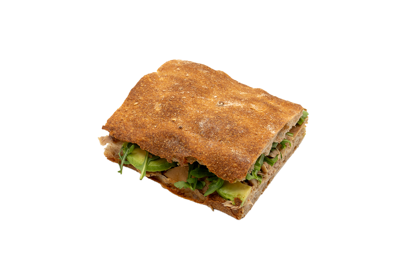 Entrepà de pa de coca amb tonyina, alvocat i rúcula, sucat a mà amb tomàquet de penjar i oli d’oliva verge extra.